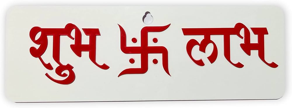 The closest English word to “Shubh” is “auspicious,” or “goodness,” as there is no like-for-like word in English language. It is written before “Lābh” to instill in the culture the idea that gaining something or getting money is meaningless if it did not come from moral sources. This could also be read to suggest that if you are virtuous, money or profit will follow.
