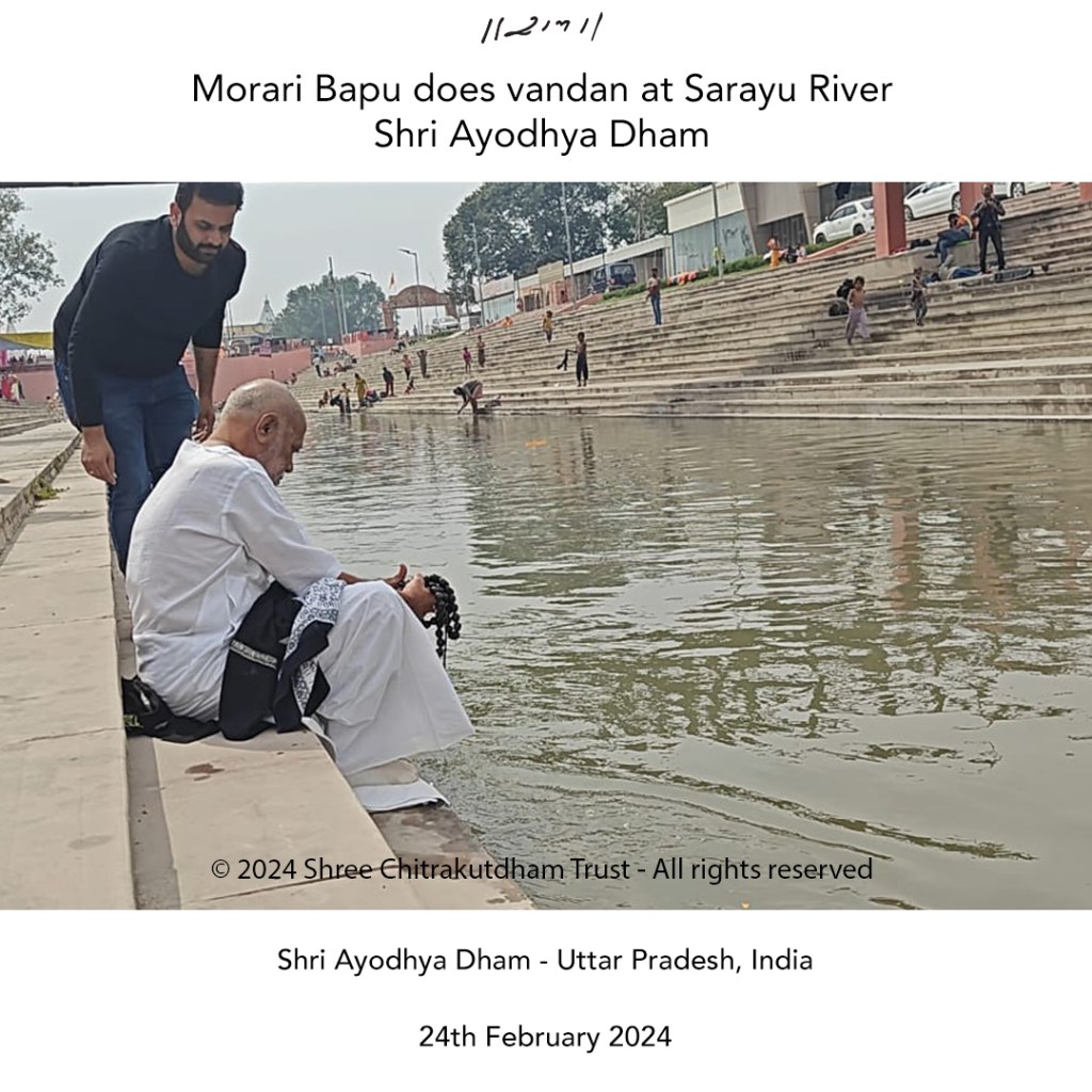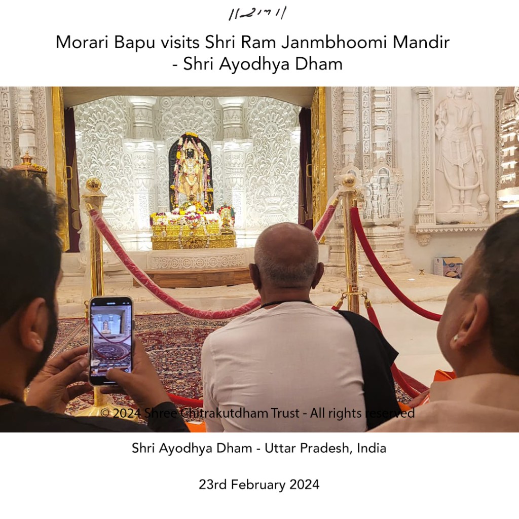 The theme of the current Rām kathā, which is being held at Ayodhyā from 24th February 2024 to 3rd March 2024, is Mānas Rām Mandir, where he is engaging in a discussion with the audience about Ayodhyā’s newly built Rām Mandir (temple).