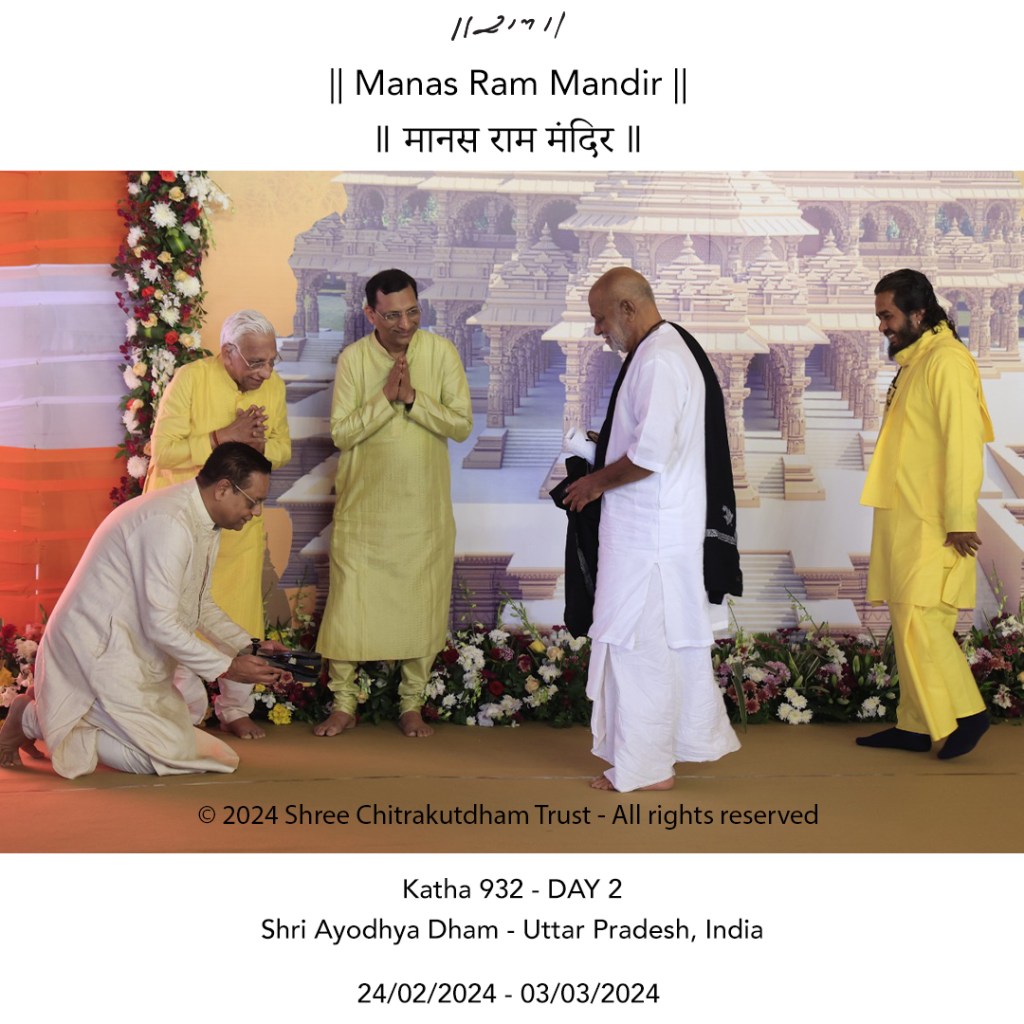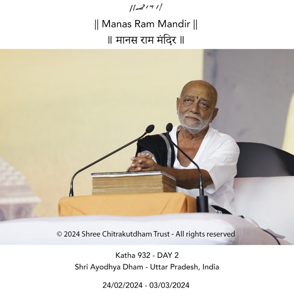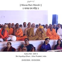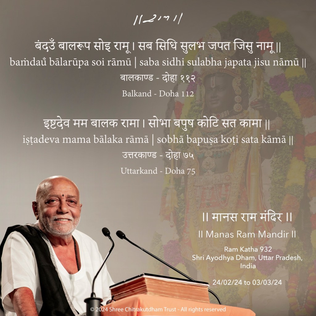 Apart from the core theme of Rām kathā, Bapu selects one chopai (verse) from about 11,000 verses in Rāmcharitamānas to serve as the primary kathā chopai pertinent to the subject matter. The one below was the katha chopai chosen for Mānas Rām Mandir katha.